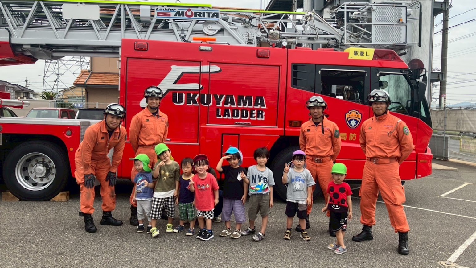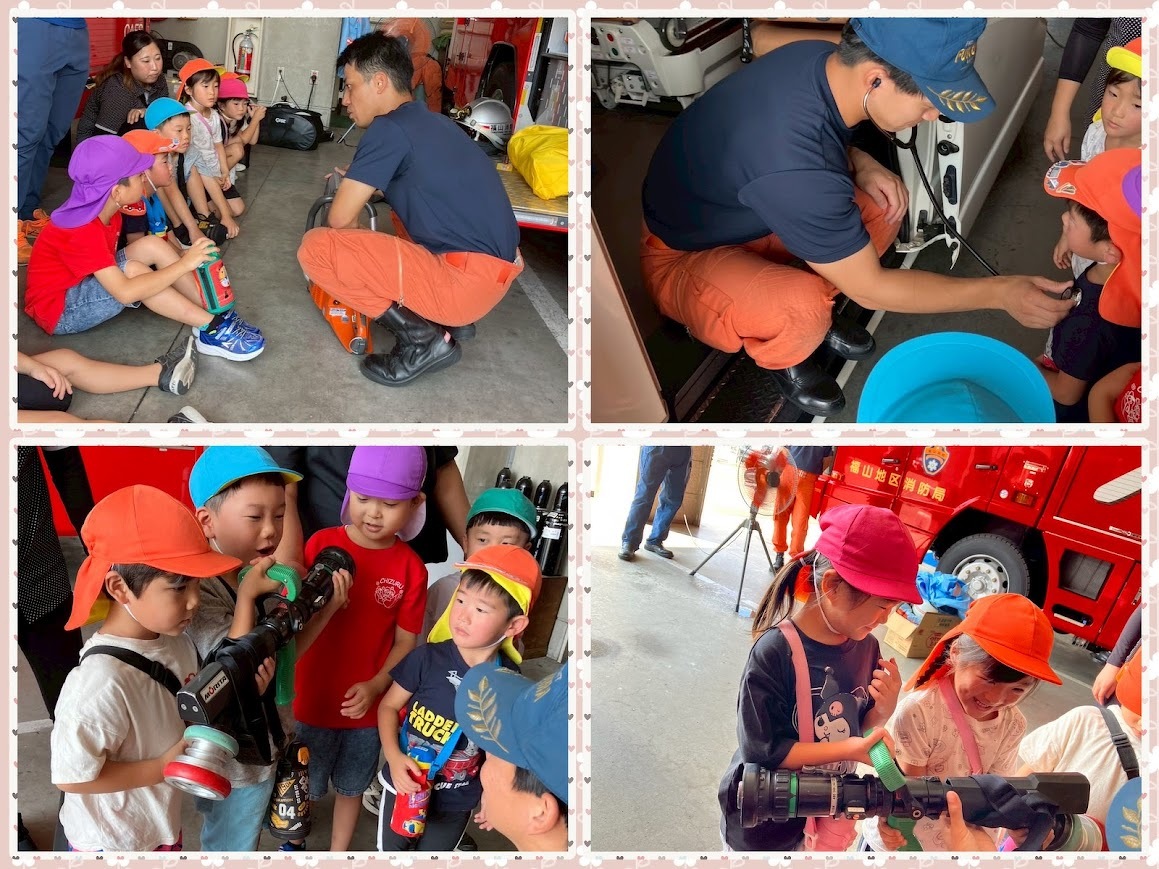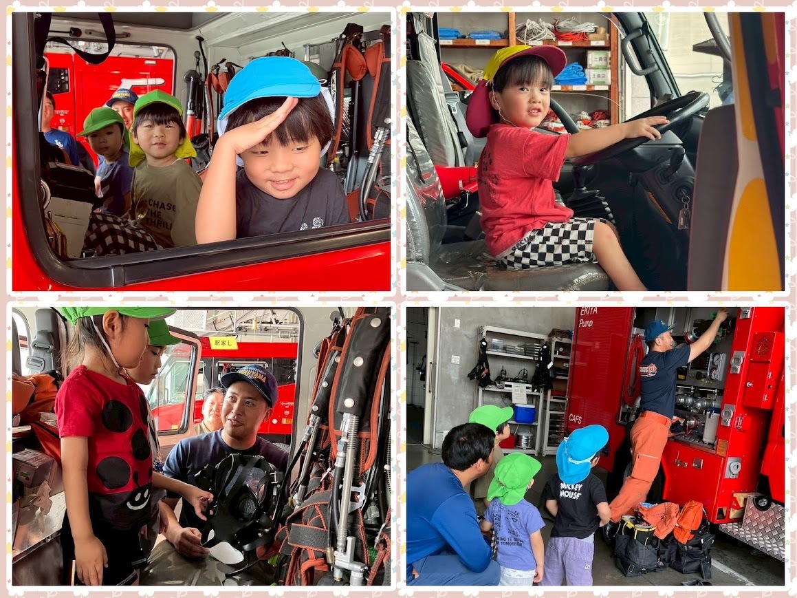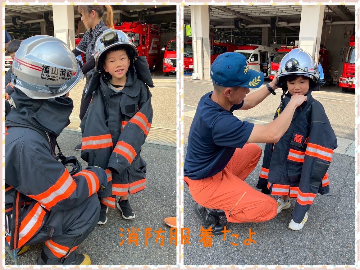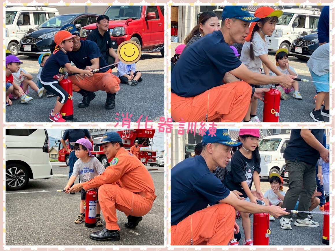 2025年09月12日(金) 活動ブログ くら・らぼ神辺☆消防署見学 こんにちは!!くららぼ神辺です。 今回は消防署見学に行きました。消防署では普段近くで見る事の出来ない車を見せてもらいました。 みんな初めて見る車に目を輝かせていました。 最後には消火器訓練をさせてもらったり、消防服を実際に着させてもらいました。 子どもたちが着ると大きい消防服も消防士さんが着るとぴったりでびっくりしました!! みんなで記念撮影もさせてもらいました。 子どもたちの見学中のキラキラした目を見るととてもうれしくなりました。