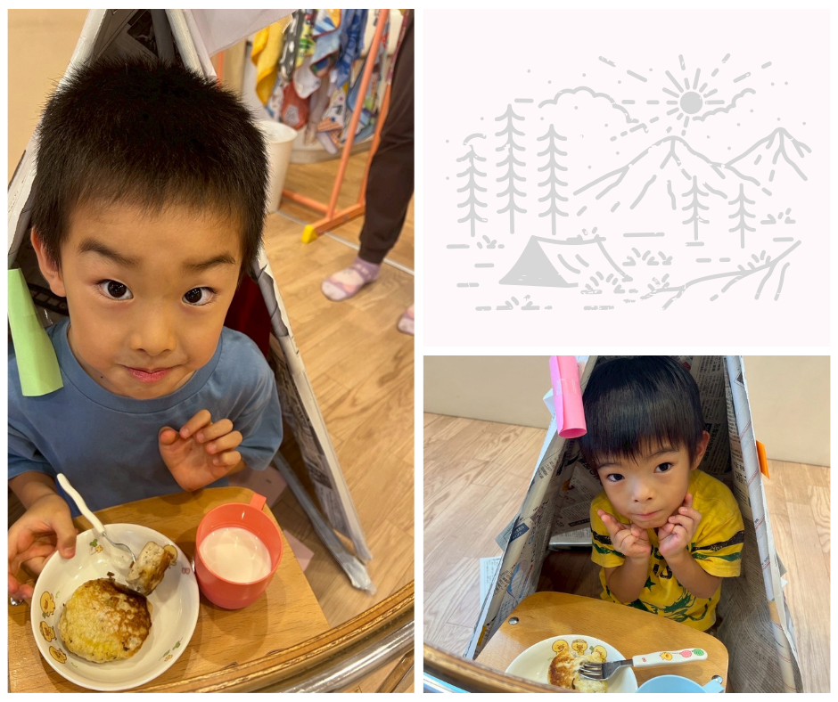 おやつはパンケーキ、椅子をテーブル替わりにしてテントの中で頂き、みんなでソロキャンプ気分を味わいましたよ。