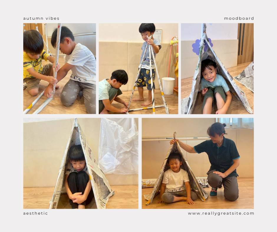くららぼの年長さんのある日の活動です。この日は、新聞紙を使って自分専用テントを作りました。