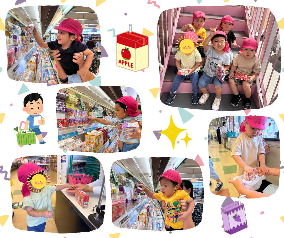 お店に着くとカゴを持って、目的のアンパンマンジュースを探す子どもたち。自分で商品を手に取って、自分でお会計をして袋に入れ、袋を握りしめて歩いて帰る姿は、とっても誇らしげでした°˖✧
