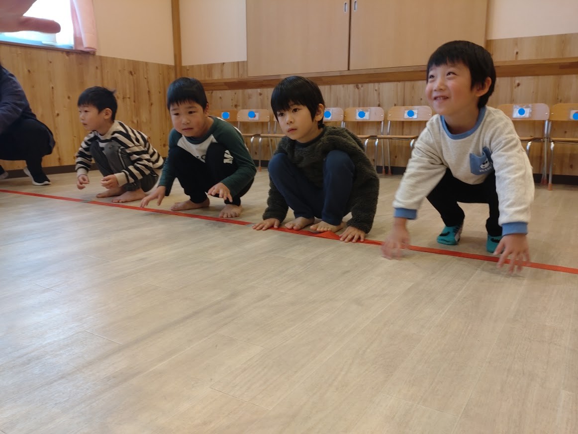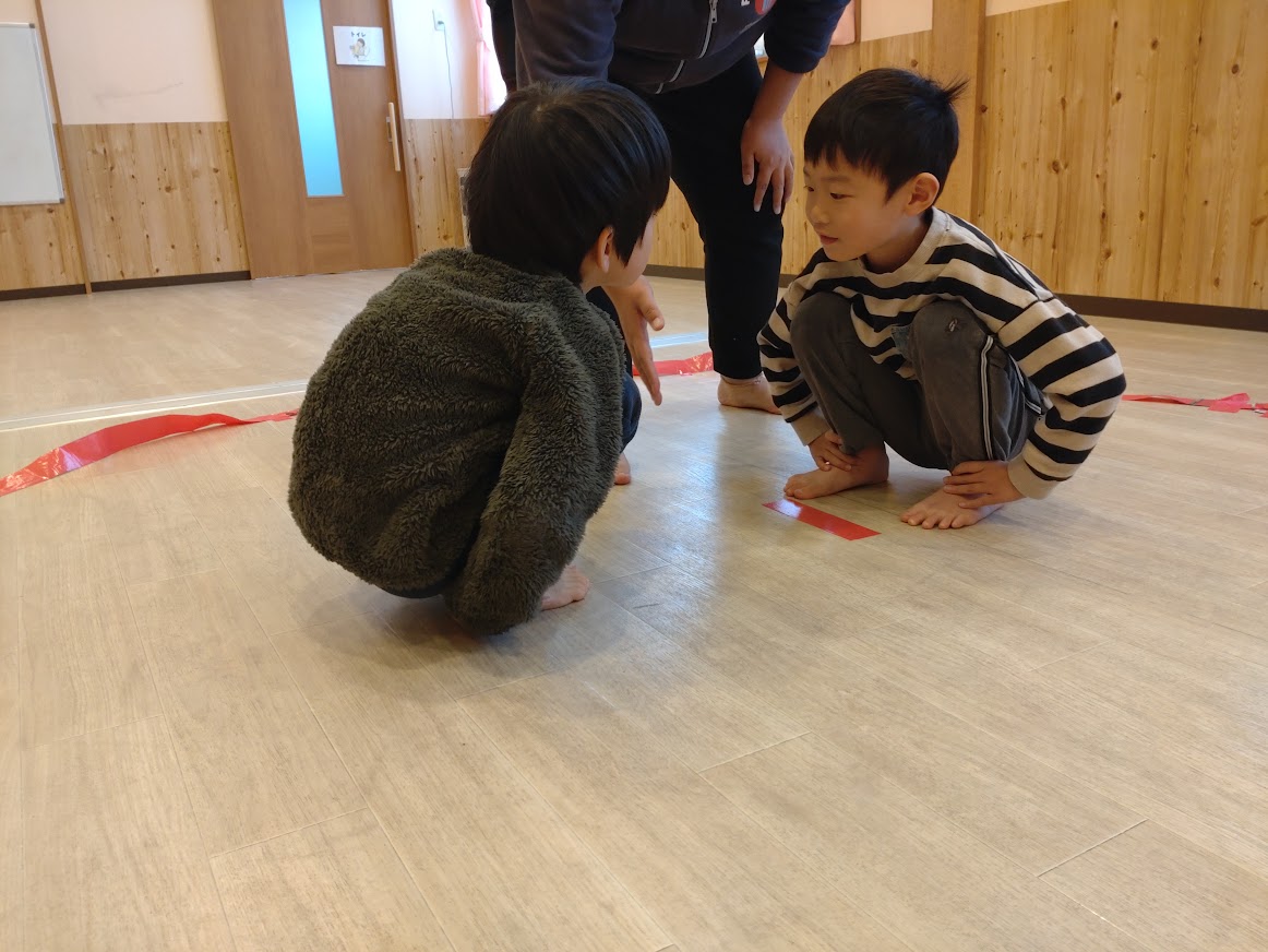 準備運動の後は教室のはじまでひよこレースをして歩く練習をしてみました♪