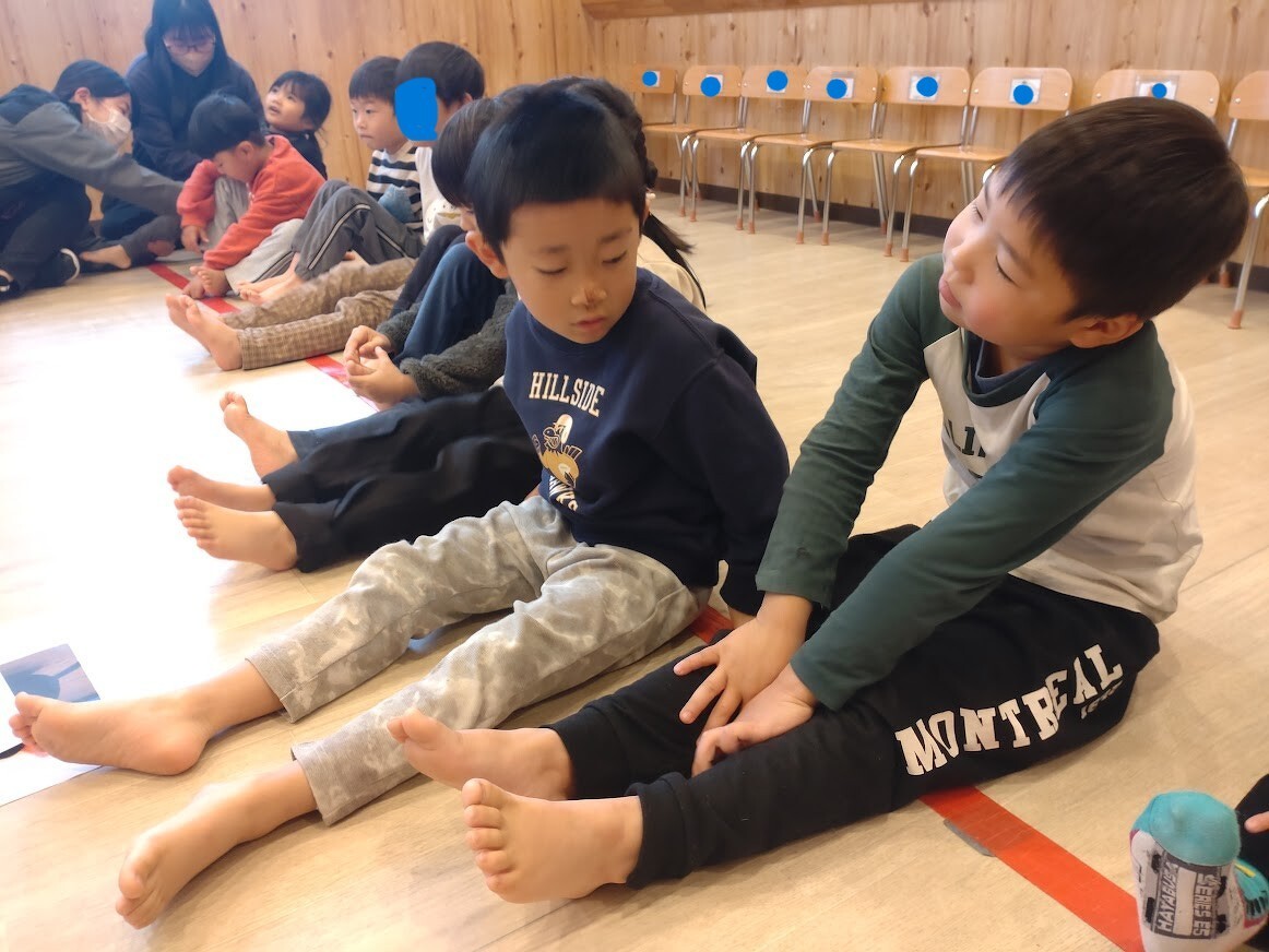 手と足で握手をしてグルグル回してみんなでほぐしました(o^―^o)