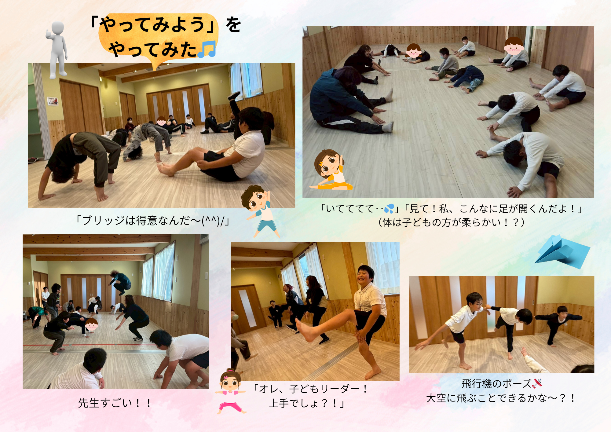 らぼでは運動療育をメインに活動を考えています。考える活動の前に、このような運動を導入として組むことがあります。11月は楽しい曲に合わせて体操しました!子どもたちの身体の柔らかさに驚いたり、先生の身体能力の高さにびっくりしたり・・・ちょっとしんどい動きでも出来なくても皆と一緒に楽しくやっています(^^♪