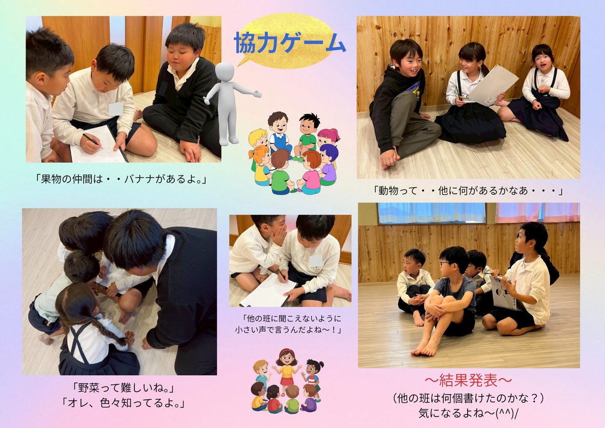 11月の活動の1つ「協力ゲーム」を紹介します!職員が「果物!」「アイリーの先生!」「動物!」「小学校にある物」・・・等々のお題を出し、各班で協力して答えを多く集める活動です。今日の約束を「自分の意見を言おう」「友だちの意見を聞こう」と決めてスタート!!