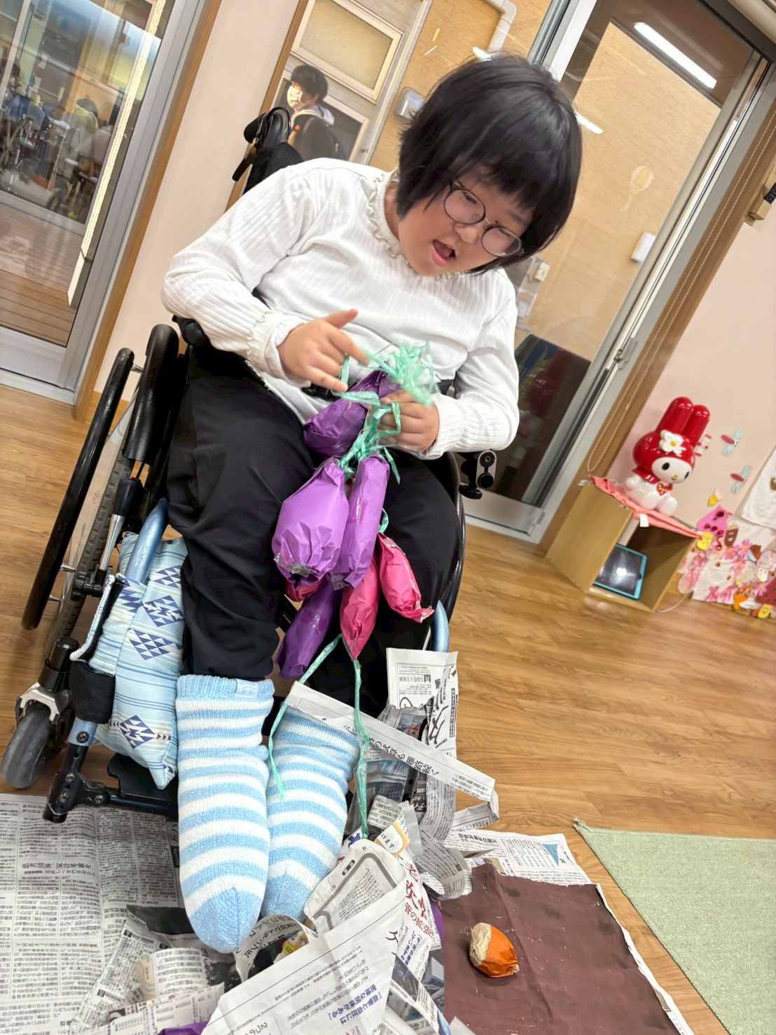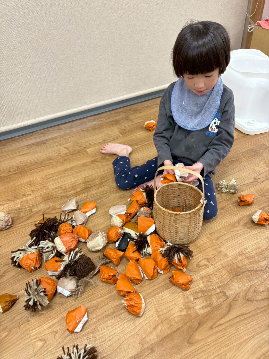 折り紙・画用紙・毛糸・新聞紙などでたくさん感覚の違う芋や栗を作りましたよ。