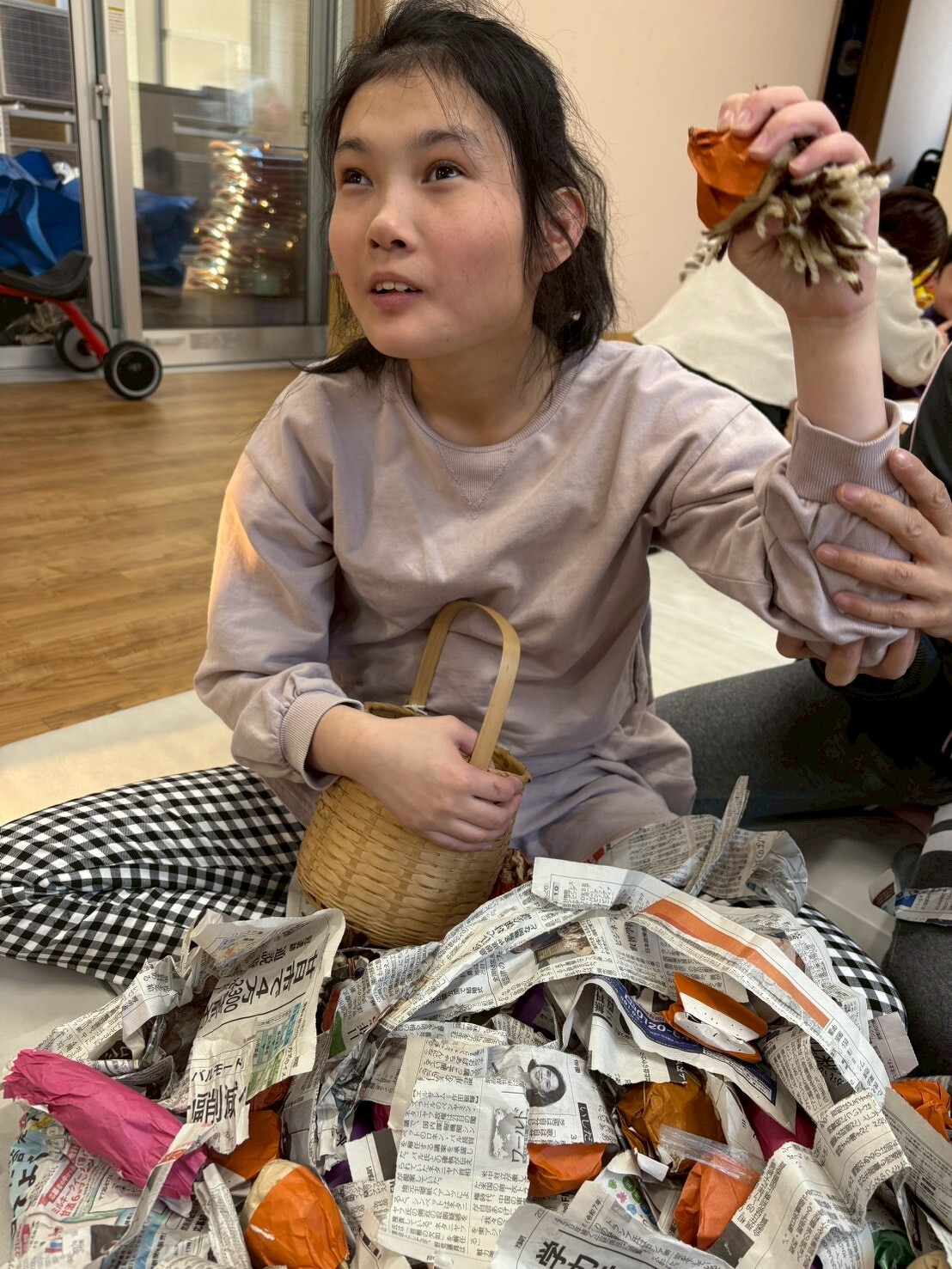 新聞紙と一緒に隠すと・・・「あれ、どこにあるんだろう」とみんなで芋と栗をたくさん探しました。