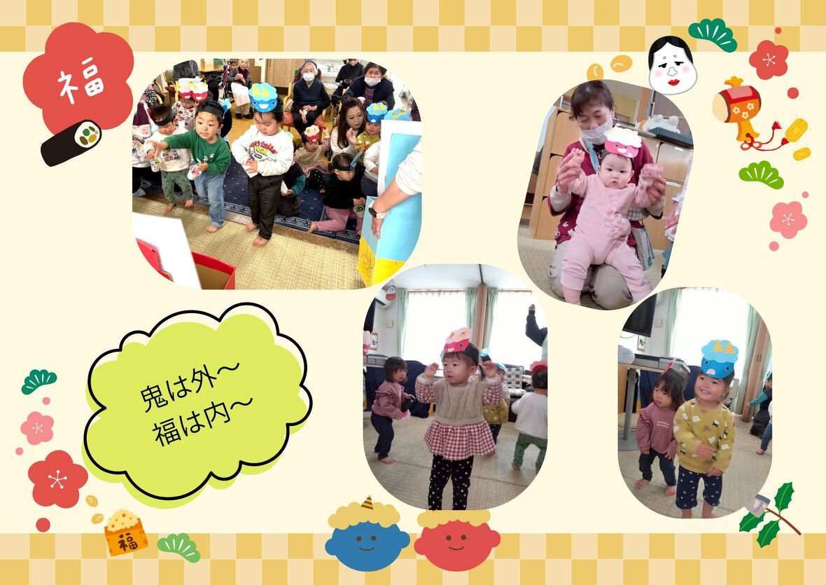 2月初めに節分会をしましたよ!わくわくキッズにも赤鬼さんがやってきました…。子どもたちの反応はそれぞれで、怖くて職員のもとへ助けを呼ぶ子もいれば、勇敢に鬼退治をする子もいたり、皆のお腹の中の鬼もきっと退治出来たはずです!