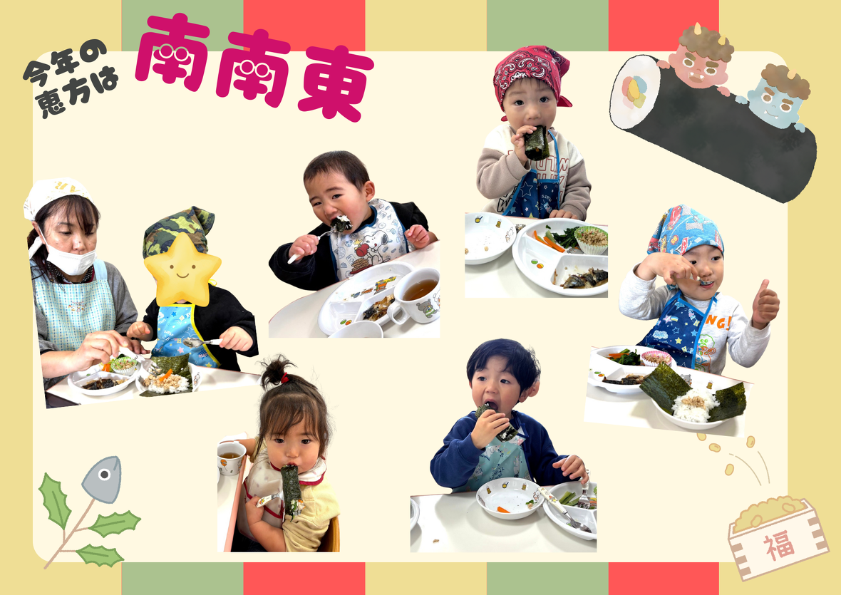 そして、二歳児さんは恵方巻を作りましたよ♪時々味見をしてみたり、それぞれ美味しい恵方巻ができました!皆で大きなお口で恵方巻を食べましたよーー♪