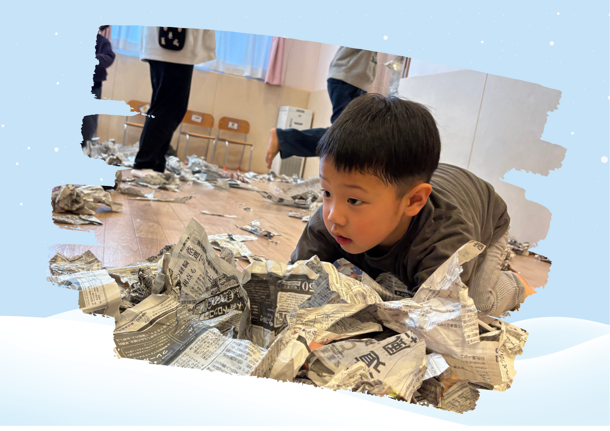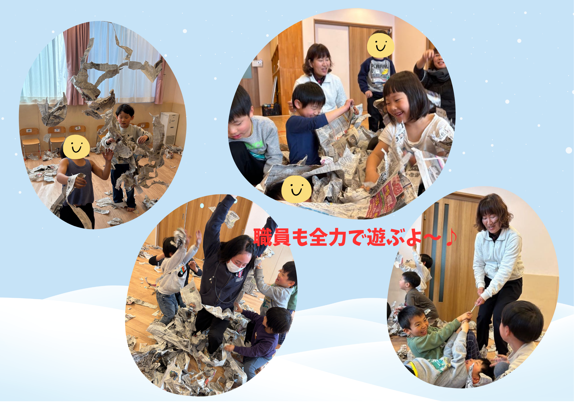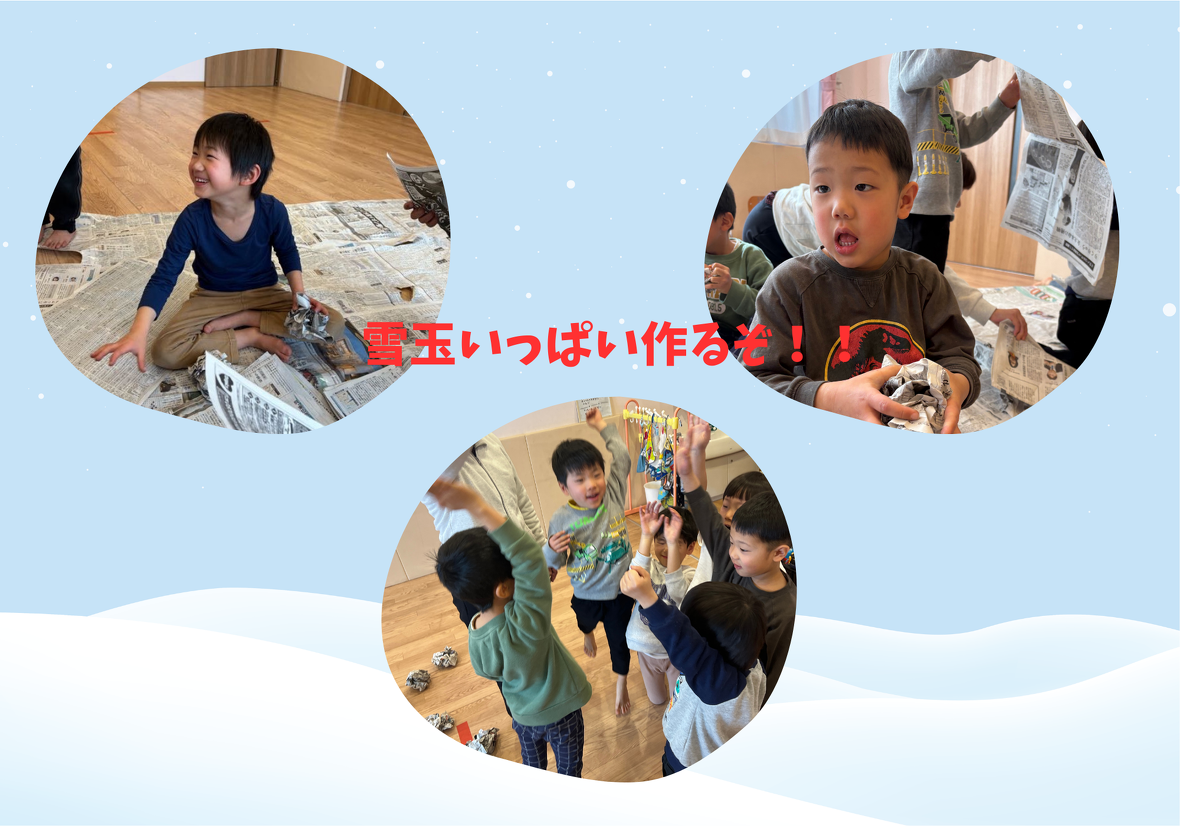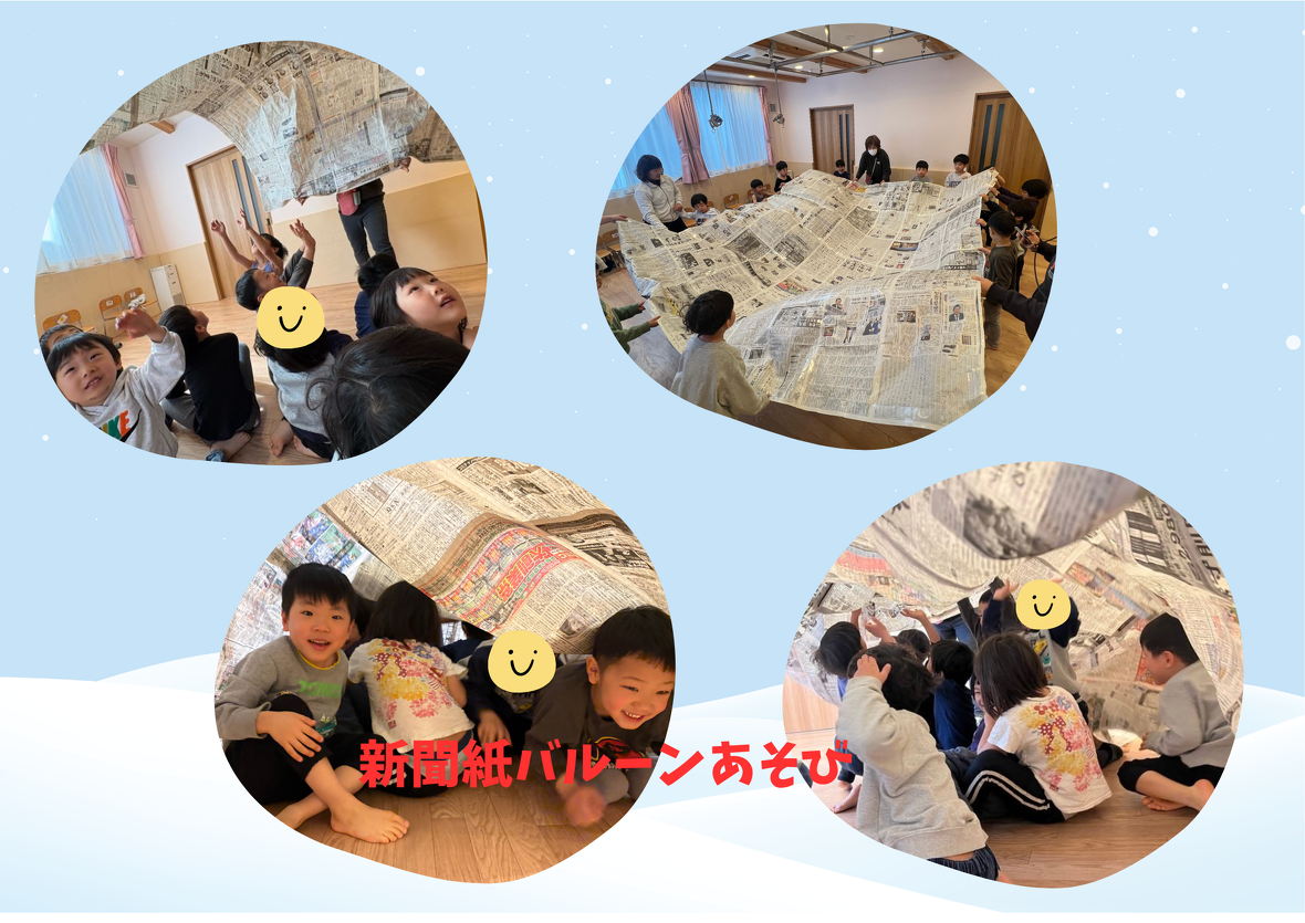 お次は、新聞紙バルーンを降り積もった雪に見立てて(少々強引ですが)、皆んなで新聞紙で雪玉を作って雪合戦をしました。実際にバトルが始まると下に敷いてあると転倒や怪我に繋がるので、新聞紙バルーンは一旦下げました。(バトルに夢中になって、写真を撮り忘れました(´;ω;`))