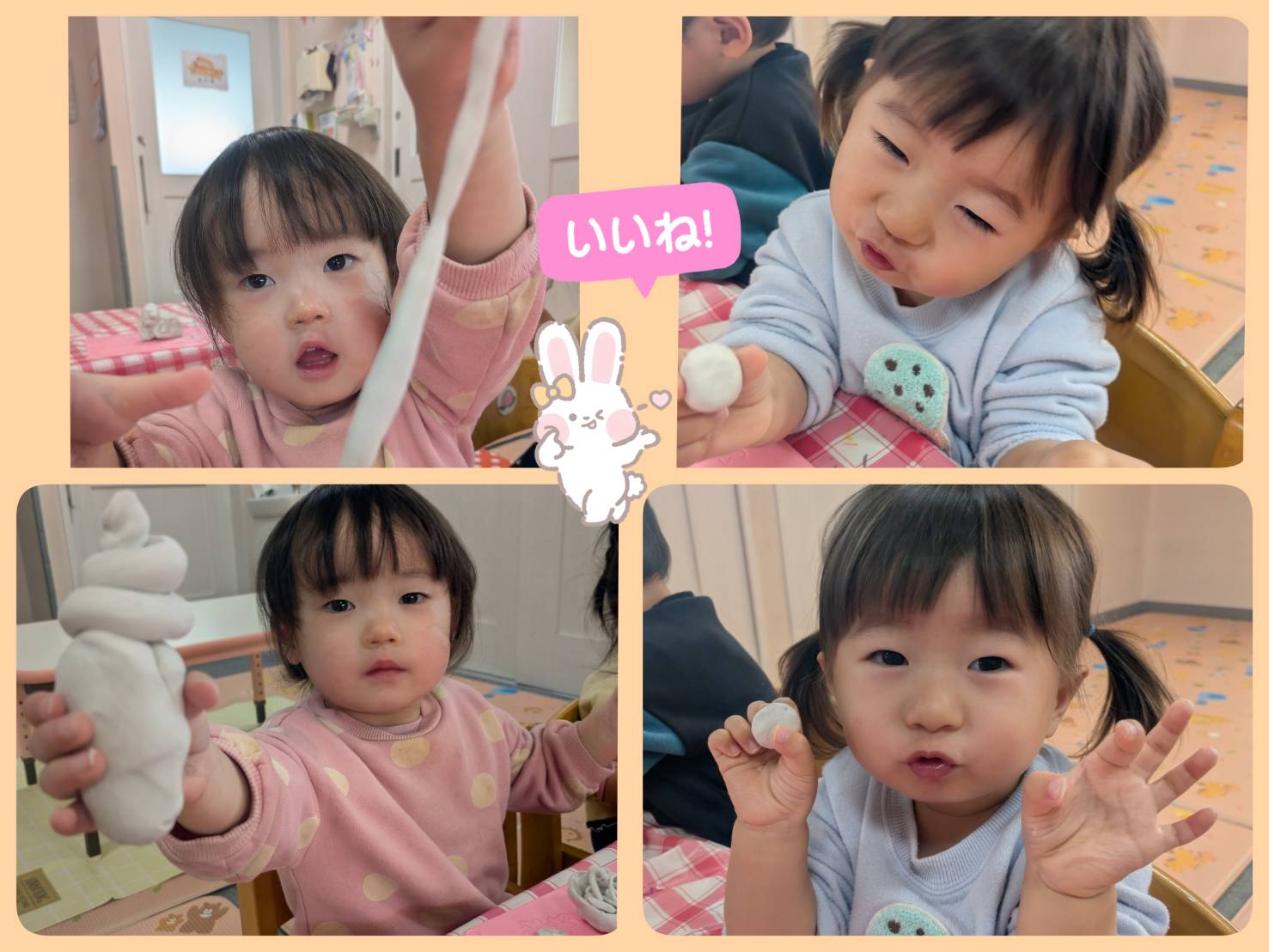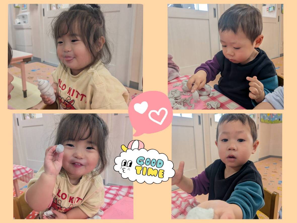 粘土あそびでは、自分で作りたいものをどんどん作る姿や、作ったもので楽しそうに遊ぶ姿が見られ、長い時間集中して遊べるようになりました。
