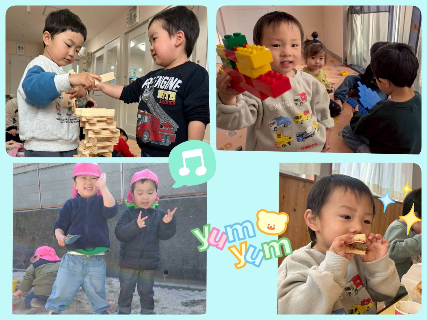 砂場やブロックなど、お友だちと協力して作ったり、自分の身長よりも高くブロックを積み上げられるようになりました。