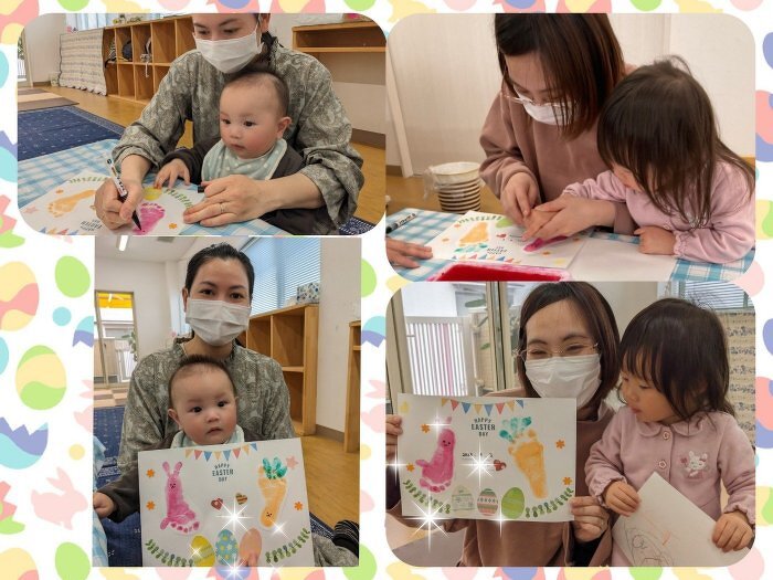 今月は、イースターの制作をしました。可愛い足形がうさぎやにんじんに大変身!とっても素敵な作品ができましたよ〜。