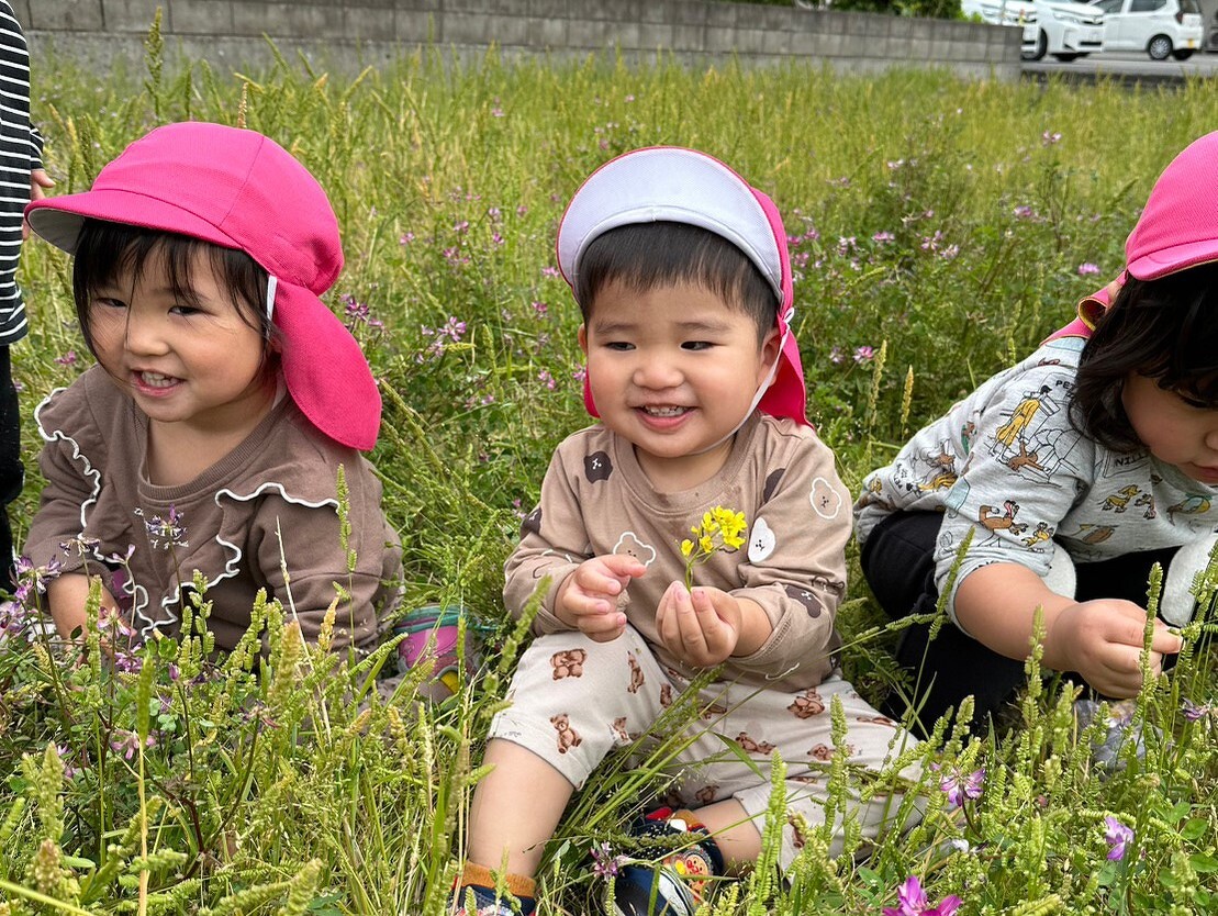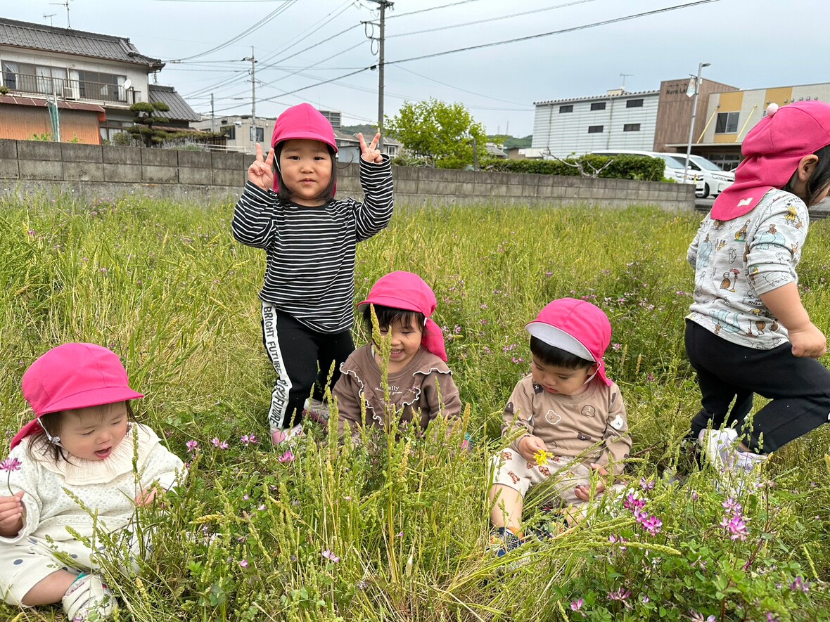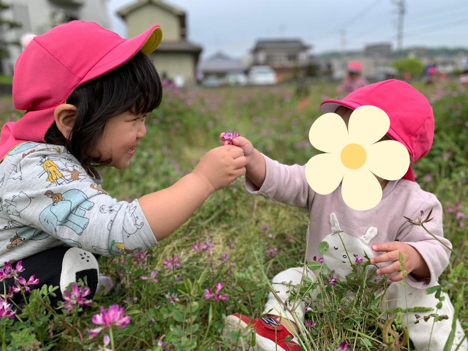 2023年04月27日(木) 活動ブログ レンゲがいっぱい! 見つけた!レンゲのお花! 毎年この時期は地域の方のご厚意でレンゲ畑にお邪魔させていただいています! レンゲを摘んだり、ゆっくり歩いて散歩したり、楽しい時間を過ごしているよ☆ 座ってお話しする子もいました(^^♪おしゃべりもはずみます♡ 小さなお友達に「どうぞ!」を渡してくれる優しい場面も見られてホッコリとした気持ちになりました(*´ω`*)