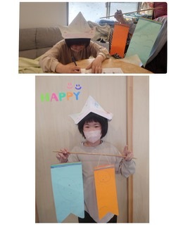 室内では、5月はこどもの日があるということで、オリジナルの兜とこいのぼりを画用紙で作っていました。
