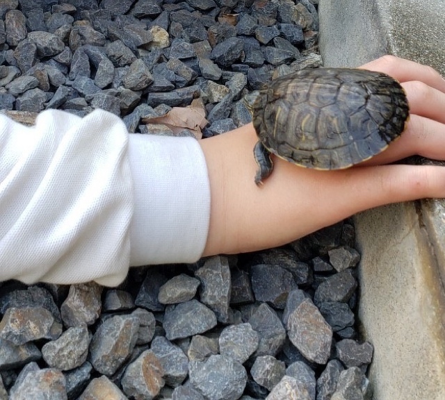 手の上にのっている亀を「先生みてみて~」と見せてくれました。