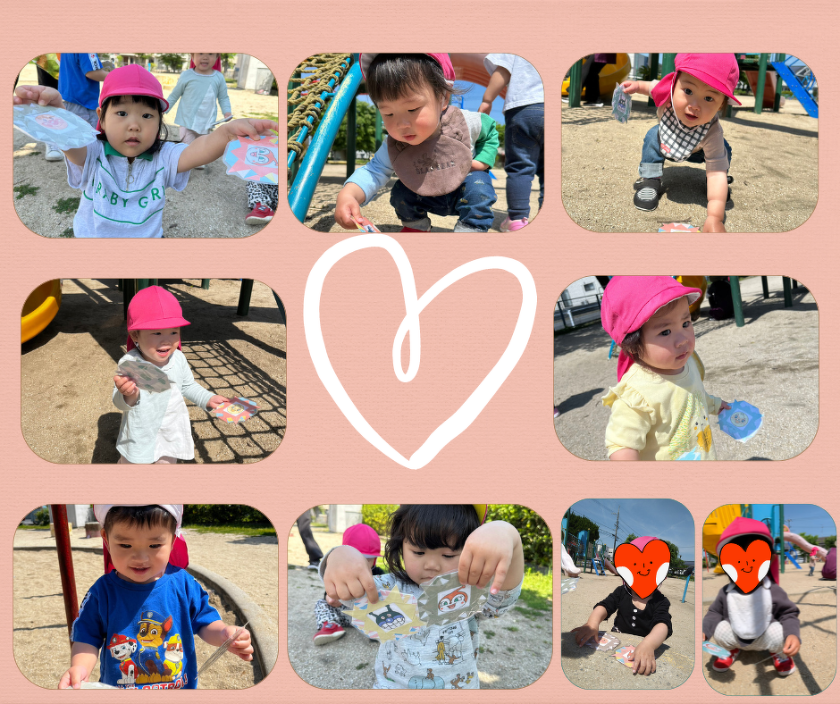 公園内の散策も兼ねて宝探しゲームをしました。アンパンマンの手作りカードを公園内に隠して子どもたちに探してもらいました。自分の好きなキャラクターが欲しくて必死に探す子、地面に落ちている石や葉っぱが気になる子、それぞれの楽しみ方でカードを探していました。自分たちで探したカードをみんなで見せ合い、「これ見つけたよ」「自分の好きなキャラクターあったよ」などと嬉しそうに教えてくれました。