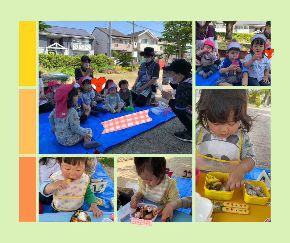 公園でテントとレジャーシートを敷いてピクニック気分でおやつやお弁当を食べました。外でお弁当を食べることが嬉しくて、周りの景色などいろんなものが気になる子もいましたが、お友だちみんなで食べるお弁当が嬉しくてテンションが上がっていた子どもたちです。朝から楽しみにしていたおうちの方が作ってくれたお弁当を見て「うわあ〜♡」と嬉しそうに見せてくれました。