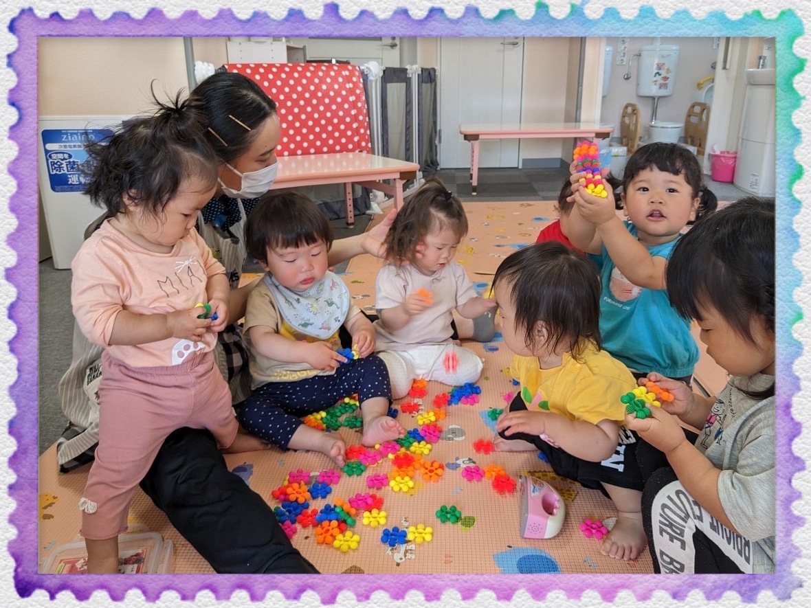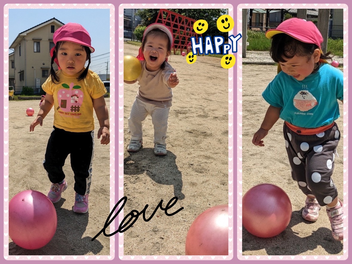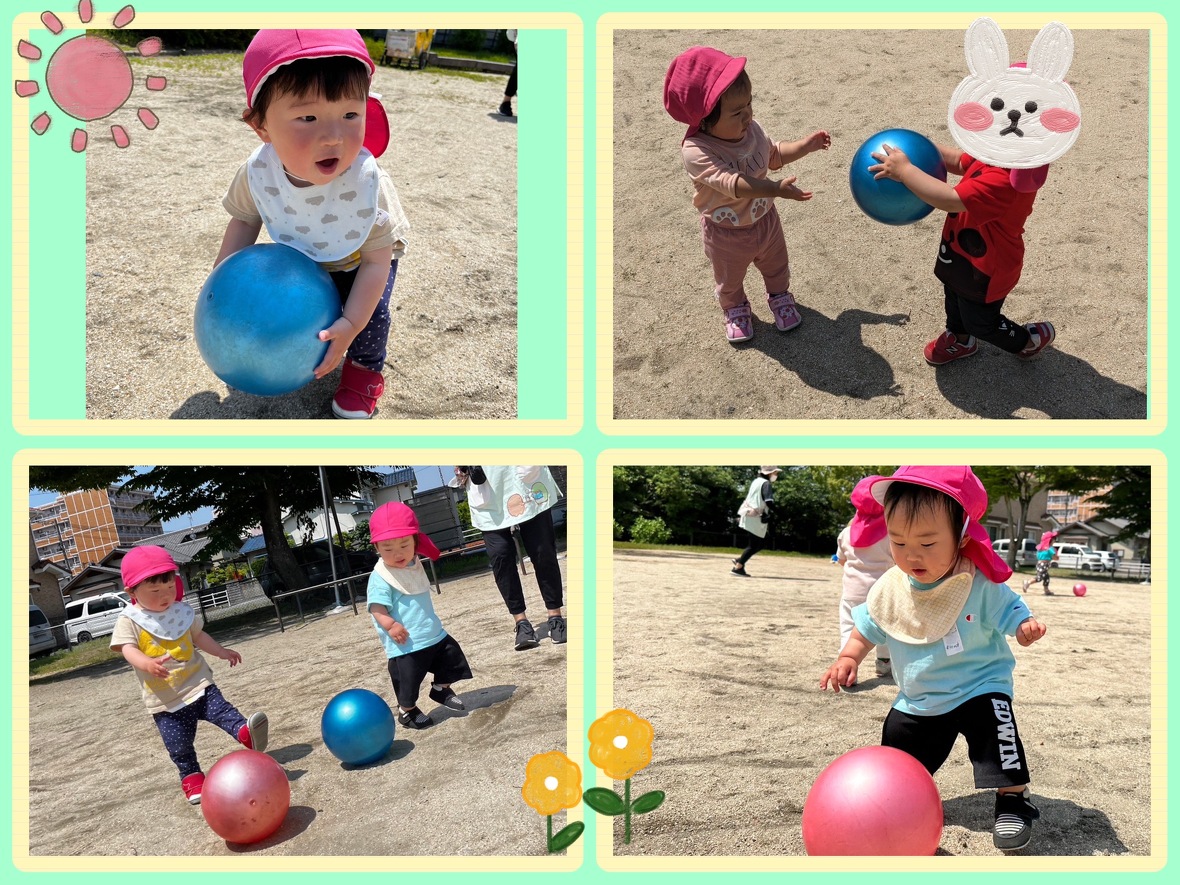 さぁいよいよボールあそび。好きなボールを選んで、ボールをもって走る子、ボールを転がしてそれを取ろうとして追いかけてもなかなかボールがとれず追いかけごっこをしている子、ボールをポーンと上にあげて、それを取ろうとしている子、みんなそれぞれの遊び方をしていましたがどの子も目がキラキラと輝いていました。中には、興奮して「わぁー」と言って走りまわっている子どもの姿も見られましたよ。保育所に帰ってからも「ボールした。」「たのしかった♡」「ポーンした。」と興奮してニコニコ笑顔で教えてくれました。