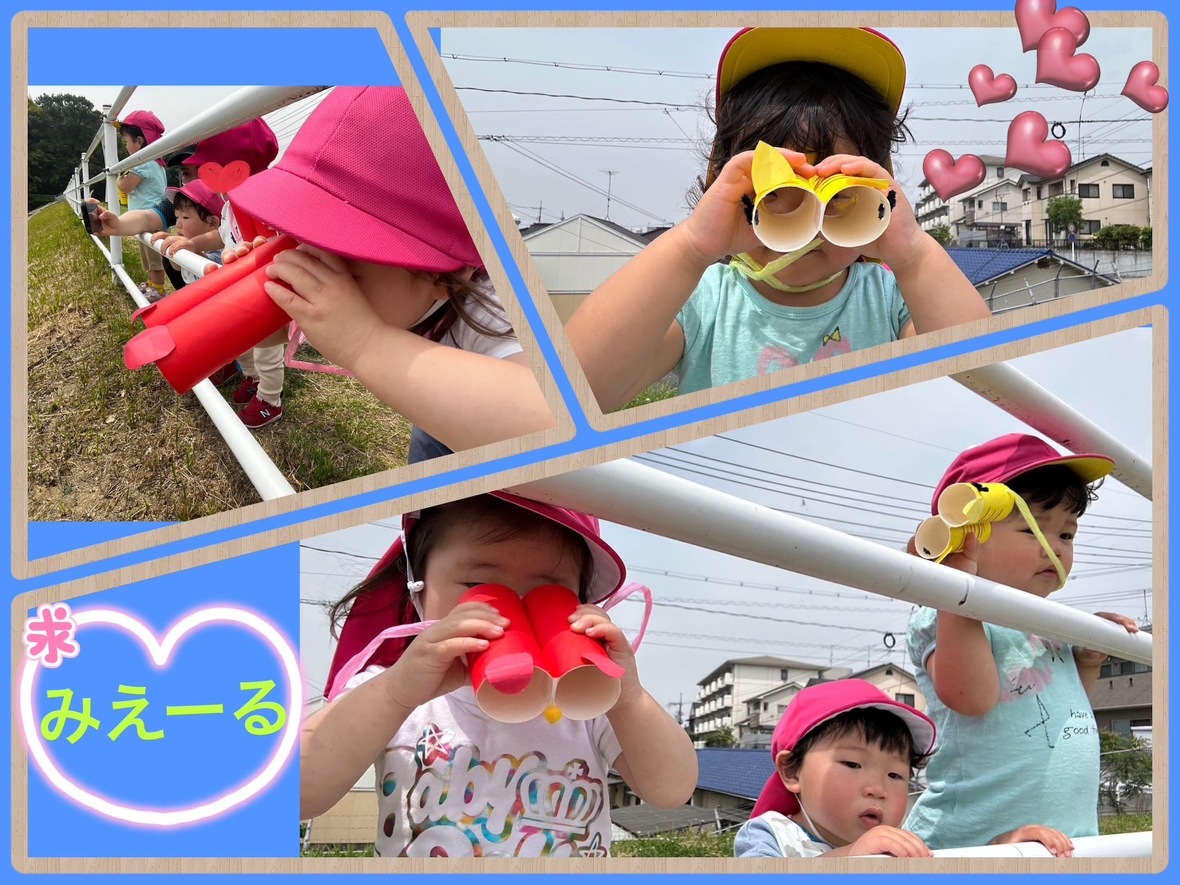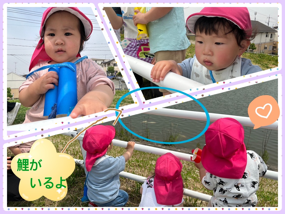 現地に付いたら、双眼鏡を首から下げましたが”水筒”をかけるように双眼鏡を下げている姿もあり、微笑ましかったです。「どこにおるんかなー?」と言って双眼鏡で見ている子どもの姿は、本当に可愛らしかったです。「”しろい”のがおる」と言って自分の目で見つけられて大喜び、すると「”あか”もおる。」と教えてくれました。前回は、鯉の姿を見ることが出来ず残念がっていましたが、今回は自分で鯉が見つけられることが出来ましたよ。しっかり歩いて帰るために水筒のお茶をいっぱい飲んで、テクテクと歩いて保育所に帰りました。