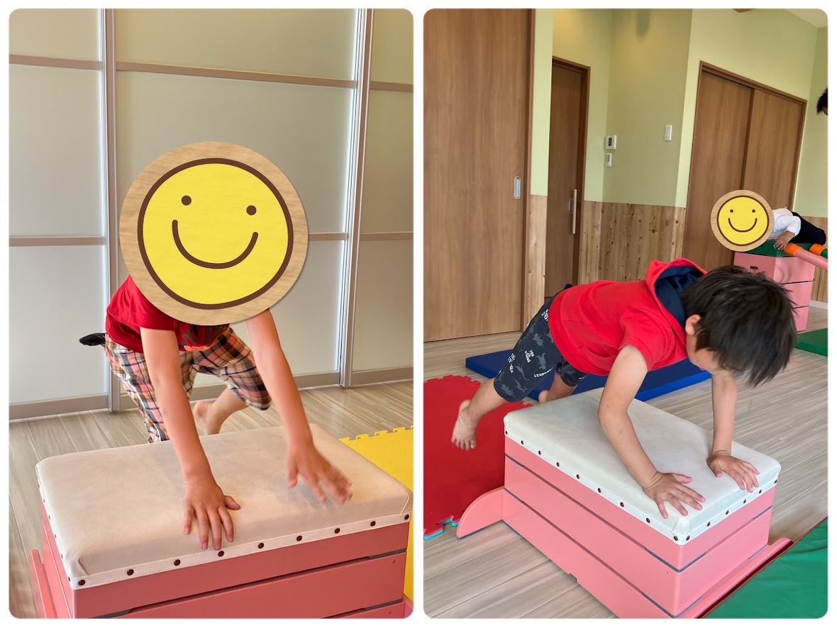 跳び箱にも挑戦!最初は跳べなかった子も、先生に「手を奥に置くといいよ!」とアドバイスを受けると、この通り!しっかり手を奥に置いて、正しい跳び方が出来ていますね♪