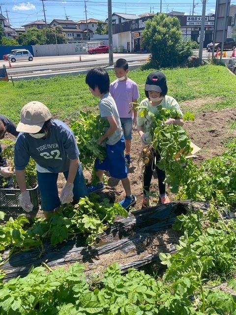 「スコップ次貸してね」と子どもたち同士で助け合いながら沢山立派なじゃがいもを収穫することができました。