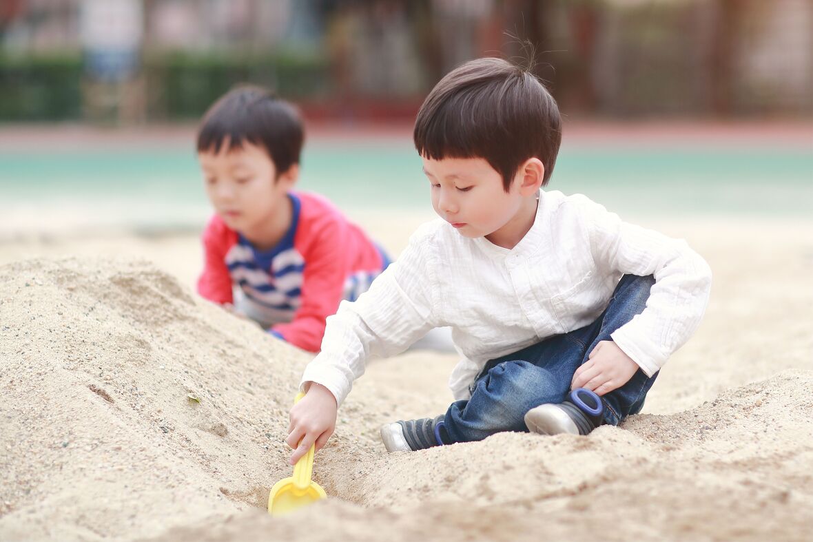 庭には砂場があり保育所の子どもたちが遊びに来て、交流の場になります。