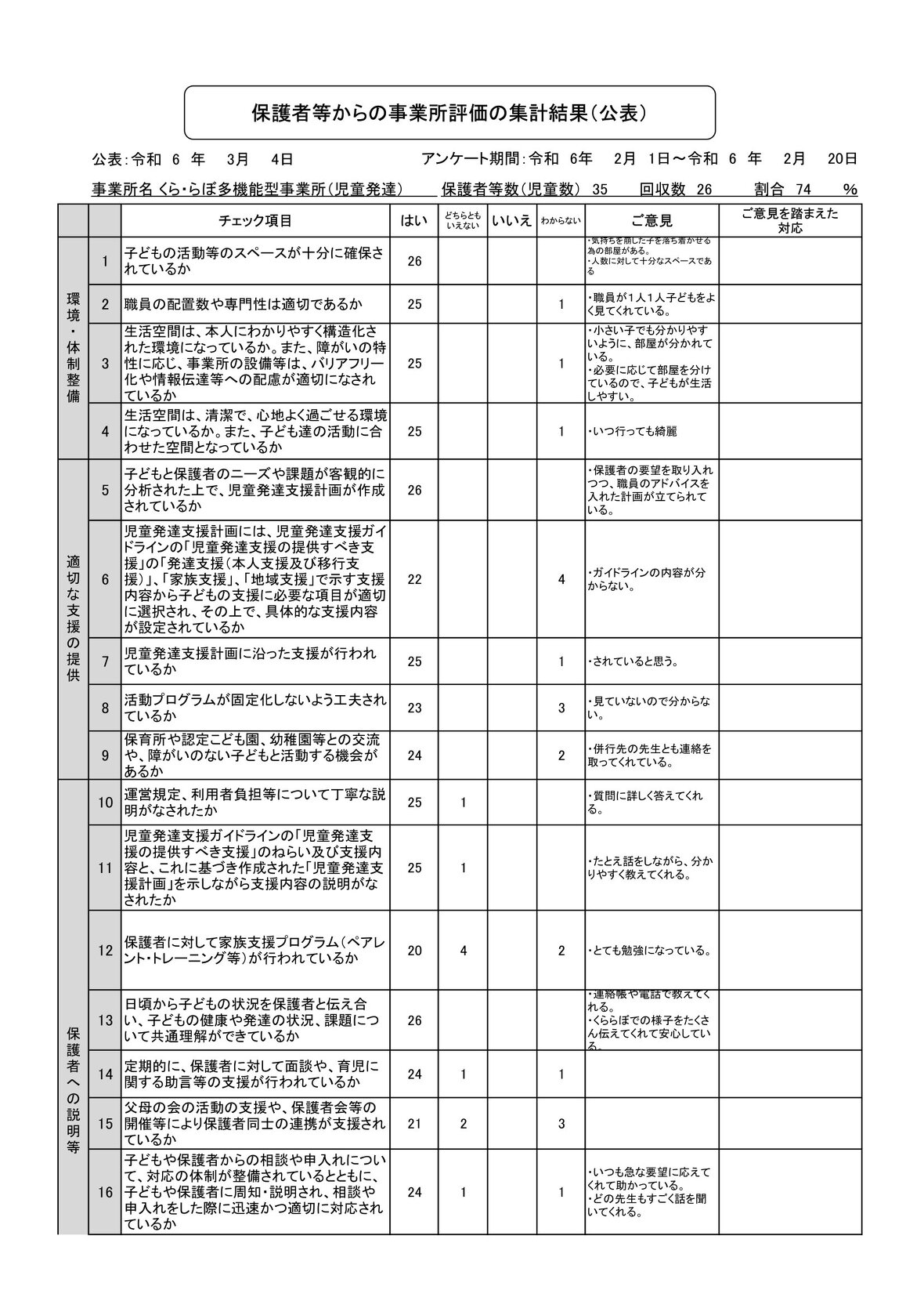 くら・らぼ多機能型事業所(児発)の事業所評価の集計結果を公表します。