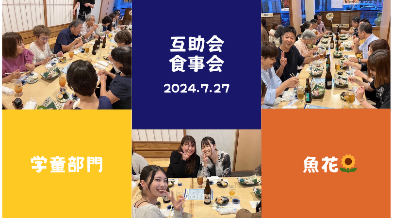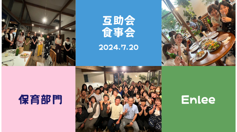 2024年08月06日(火) お知らせ 互助会☆食事会 プロエイドでは互助会(TY会)があり、部門ごとに分かれて7月に食事会が開催されました。普段、なかなか一緒にごはんを食べることがない他事業所の職員の方々と一緒に話しながら食事を楽しみました! 7月20日には保育部門でEnleeに集まり、ごはんやおしゃべりを楽しみながら笑ってばかりの時間でした(*^^*) 7月27日には学童部門で魚花に集まり、美味しいご飯を食べました♪ また楽しい企画をしていきます(^^)/
