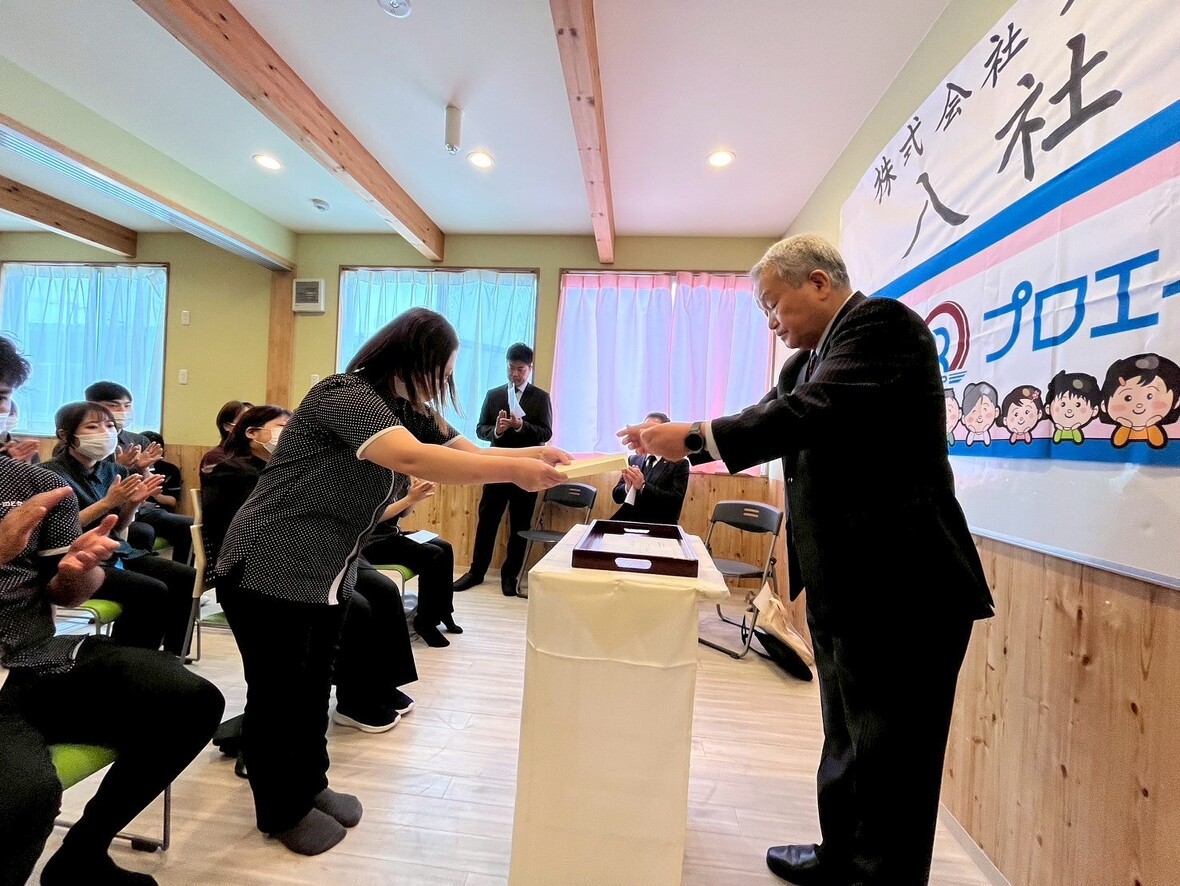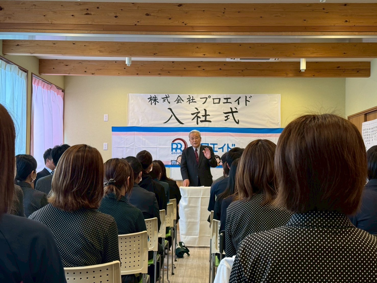 2025年04月12日(土) お知らせ 2025年度入社式 2025年度の入社式がありました! 2025年4月11日(金)プロエイドの入社式があり、新たに入社した職員、昇格者が集まりました。 代表取締役、取締役、統括責任者と挨拶がありました。 昇格者は辞令交付もあり、気持ちも一新で頑張っていきましょう! 新入社員の挨拶もありました。 新たに加わったメンバーと一緒に盛り上げていきたいと思っています!これからもチーム一丸となって頑張っていきます! よろしくお願い致します!!