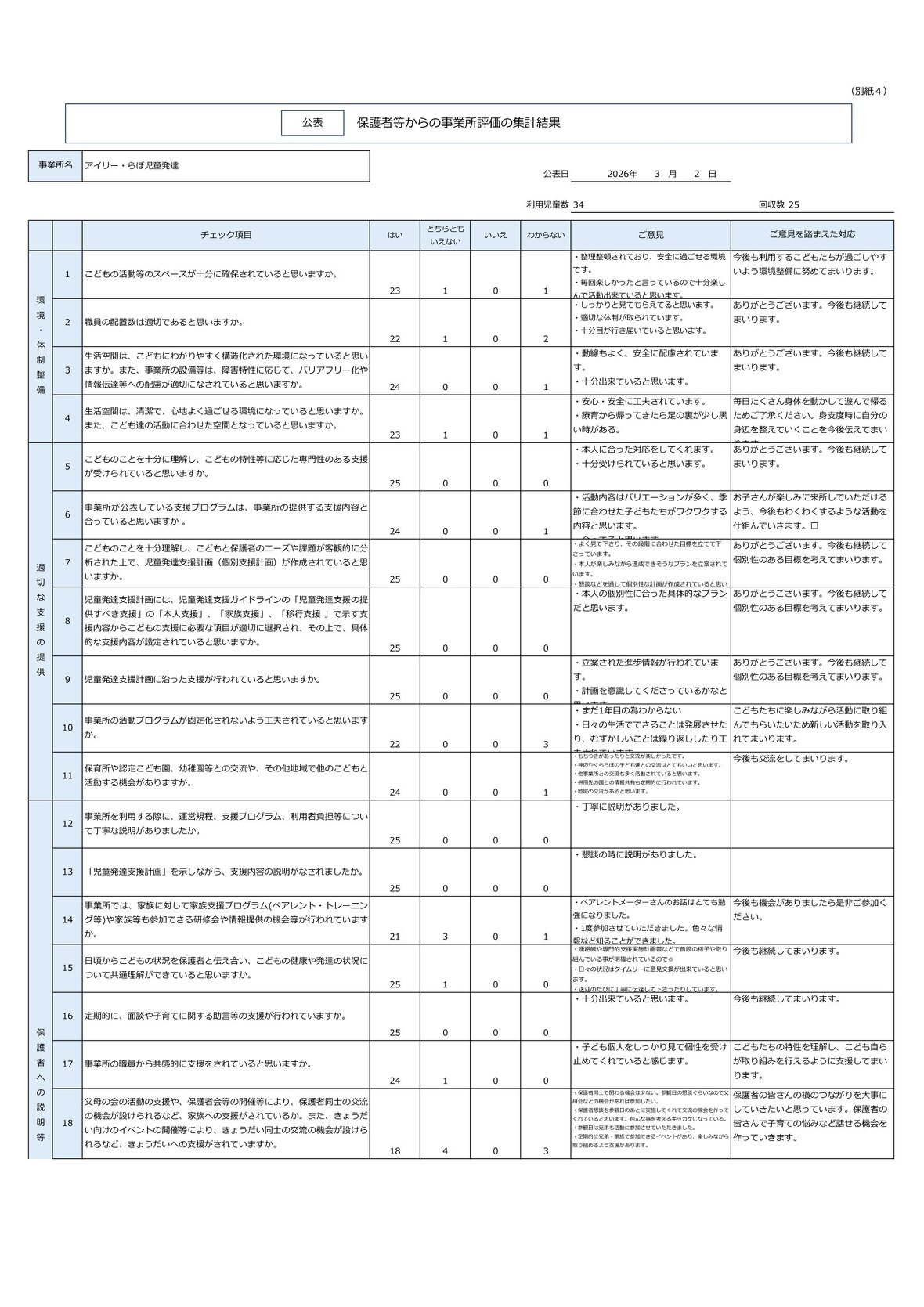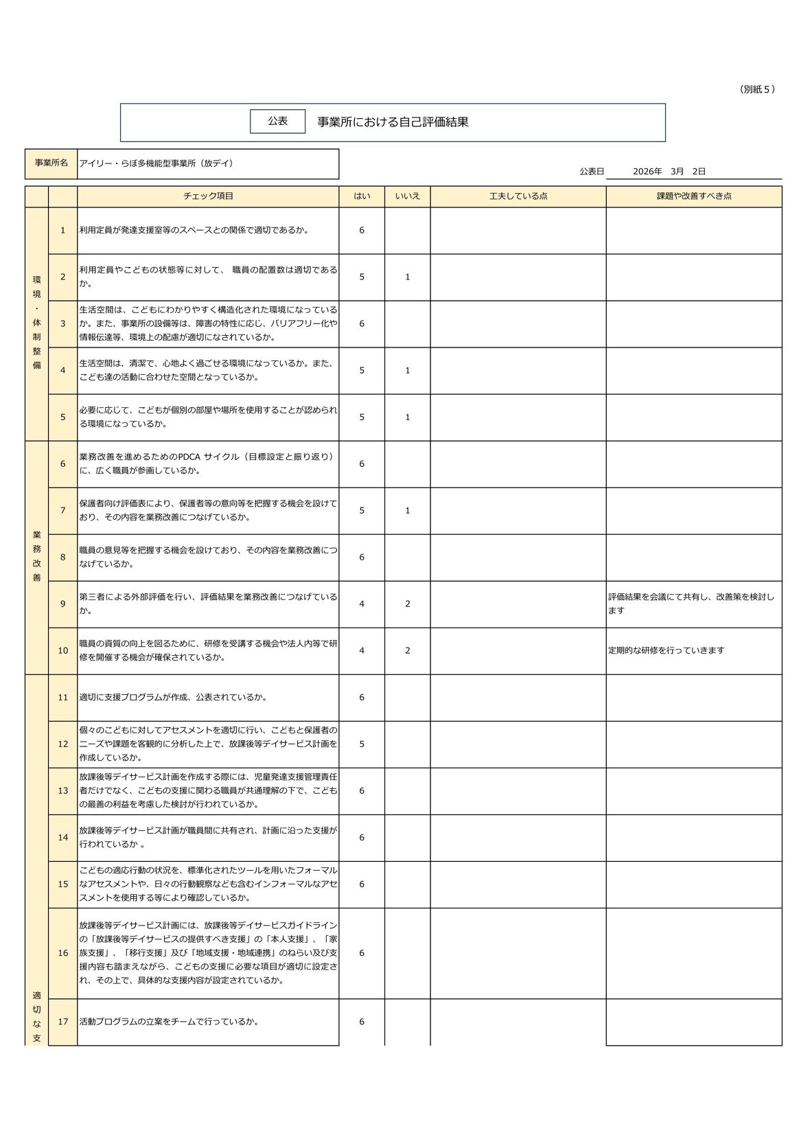 2026年03月02日(月) お知らせ アイリー・らぼ多機能型事業所(児発)事業所評価について アイリー・らぼ多機能型事業所(児発)の事業所評価の集計結果を公表します。 保護者等評価 事業所職員評価 事業所における自己評価総括表