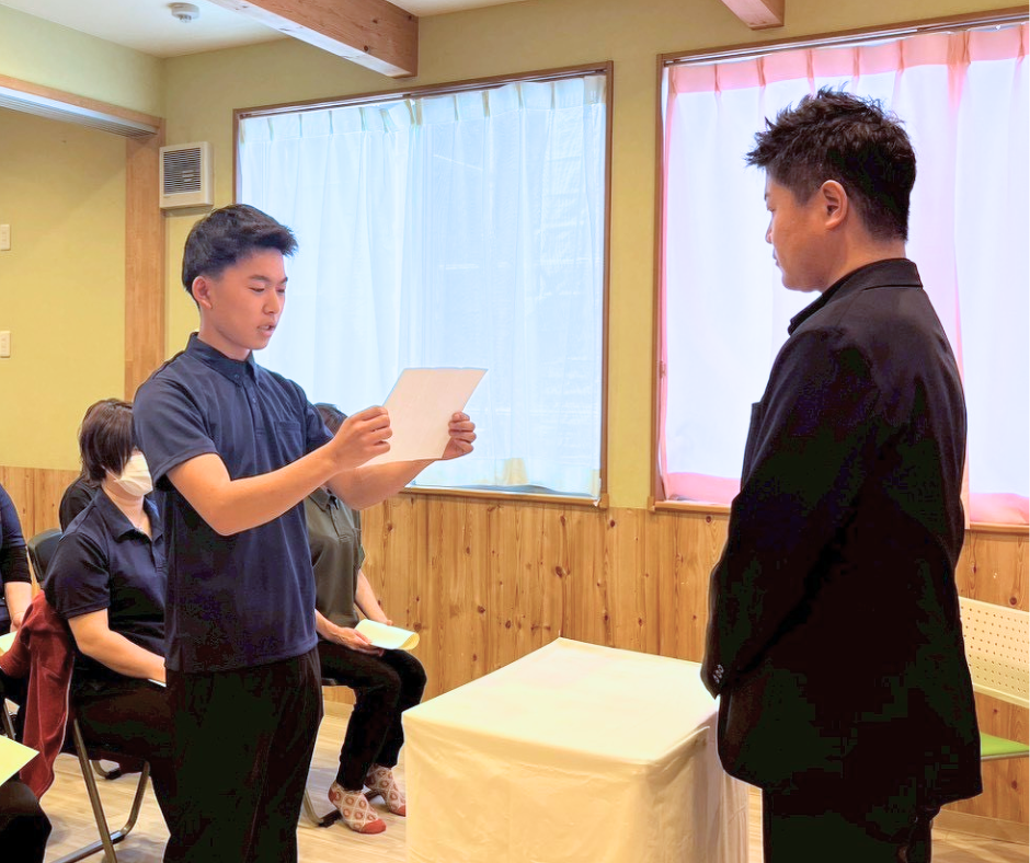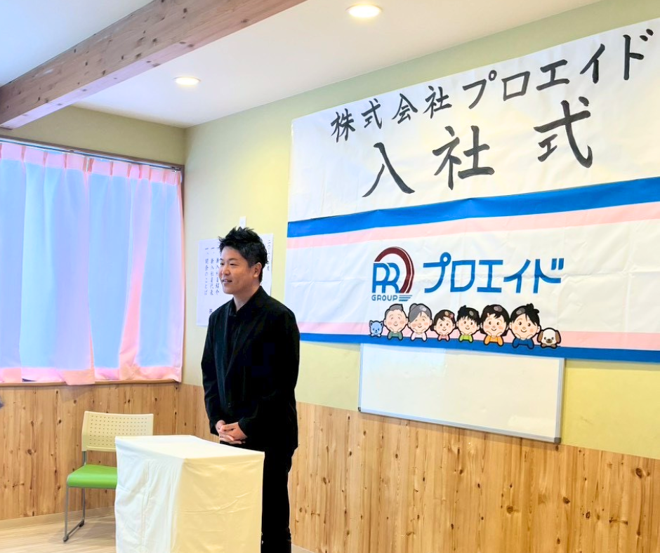 2026年04月08日(水) お知らせ 2026年度入社式! 2026年度の入社式がありました! 2026年4月8日(水)プロエイドの入社式があり、新たに入社した職員、昇格者が集まりました。 統括責任者、各事業所管理者代表の挨拶がありました。 昇格者、新入社員ともに辞令交付があり、新入社員は紹介してもらい辞令交付を受けました。これから頑張っていきましょう! 新入社員の挨拶もありました。 新たに加わったメンバーと一緒に盛り上げていきたいと思っています! これからもよろしくお願い致します!!