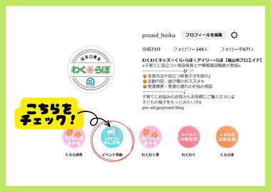 2023年05月24日(水) お知らせ わくわくキッズ南蔵王 2023年度イベント年間行事のお知らせ わくわくキッズ南蔵王では、毎月様々な子育てイベントを開催しています。 ぜひぜひあそびに来てくださいね~(^^♪ Instagramに各イベント情報を掲載していますので、ご覧ください♪ 今後のイベントについてはストーリーズで配信後、ハイライトのイベント情報にて何度でも閲覧できます。 LINE公式アカウントに登録していただくと、イベント情報の配信や予約ができます! ⇓こちらから、ご登録くださいね。
